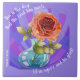 Um azulejo floral brilhante de flores pintadas; cor-de-rosa cheio floresce em um vaso de água, em uma palha de roxo. Escriturado ao redor da flor é o verso de Salmo 118:24. "Este é o dia que o Senhor fez, vamos nos regozijar e ficar felizes!" Acessório perfeito para adicionar um toque de bênçãos e um splash de cor à sua cozinha (ou qualquer outro cômodo da casa!) Use como uma trivit, ou uma peça de arte.
