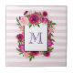 Azulejo de cerâmica monograma com buquê floral composto por rosas de rosa claro e papoilas cor-de-rosa escuro com muitas folhas verdes e peludas. Um quadro em camadas para colocar sua dentro de letra monográfica personalizada. O fundo é um padrão de listras rosa-macio.