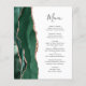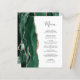 A borda esquerda deste elegante cardápio moderno de casamento apresenta uma esmeralda verde aquarela agata borda com falso rosa dourado. O texto personalizável combina o script de escrita manual de cinzas de carvão branco e as fontes de impressão em um fundo branco. O verso apresenta um design emerald verde e rosa dourado.