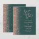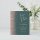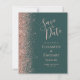 A borda esquerda deste elegante casamento moderno salve o cartão de data apresenta um rosa dourado falso borda brilhante. O texto personalizável combina manuscrito colorido cor branco de rosa pálido, fontes em copperplate e itálico em um fundo verde escuro. O verso apresenta um design verde escuro e rosa dourado correspondente.