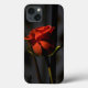 Uma capas de iphone enfeitada com uma rosa vermelha simples, iluminada de forma fraca.