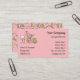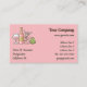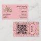 Composição do vinho rosa. Garrafa, vidro, saca-rolhas e uvas. Cor de fundo personalizada. Muitos campos de texto personalizáveis no lado frontal. Padrão constante, ícones de ID social e código QR no verso.