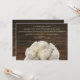 Um convite de casamento com uma imagem de rosas brancas no fundo sobre um fundo de madeira marrom-escura. Personalize o texto com detalhes da sua ocasião.