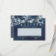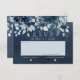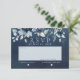 Um cartão de marinho de cercado RSVP com marinho azul d'água pintado de fundo com cor d'água pintada de florais em marinho e azul poeirento, com a RSVP em letras maiúsculas de serifa com sua resposta por data abaixo e uma grande área de cinza clara para os convidados escreverem seus nomes com uma caixa pedindo que o número de convidados seja escrito pedindo para aceitar alegremente ou recusar. Seus nomes e data numérica estão gravados na parte traseira desta placa de gabinete RSVP.