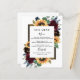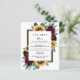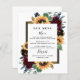 O design apresenta elegantes rosas em aquarela, peônias, flores silvestres e girassóis em vários tons de vermelho burgundy, azul-marinho e mais sobre uma grinalda de folhagem de eucalipto. O design também apresenta uma moldura de madeira de celeiro sob a grinalda. Um layout de fonte único complementa o design geral. Você pode alterar a cor do fundo na frente e no verso para a cor de sua escolha ou deixar ambos configurados para branco. Visualize a coleção nesta página para encontrar produtos de papelaria de casamento correspondentes.