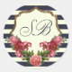 Rosas elegantes, quentes e vermelhas e rosa-do-campo com riscas marinho azul e marfim brancas e dourado esmaltado esboçado, autocolantes monogramas. Este design clássico e sofisticado é perfeito para a mulher de classe, tendências e na moda. Personalize com suas próprias iniciais personalizadas de monograma. Todas as impressão de fotos.