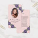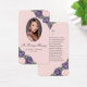 Cartão de memória floral roxo e rosa/cartão de oração funerária elegante com uma foto adornada com rosas roxas e rosa e flores de hálito de bebê em um fundo de pelúcia.