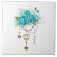 Chave de ouro antiga com rosas de turquesa de tendência, decoradas com folhas de ouro branco e miçangas cor-de-rosa e azuis. Cor agradável. Rosas de turquesa. Ouro branco. Tifania azul.