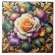 Um arranjo espantoso de rosas vibrantes e flores cortadas apresenta detalhes intrincados, cercados por padrões folhosos elaborados em cores ricas.