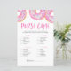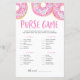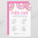 Verifique na bolsa os itens da lista. A pessoa com mais pontos é a vencedora! | Adicione este cartão de jogo "O que na sua bolsa" ao seu chá de fraldas. Esta placa de jogo trivia chá de fraldas apresenta rosquinhas cor-de-água cor-de-rosa com bordas coloridas. Personalize adicionando nomes, eventos e datas. Este jogo de bolsa cor-de-rosa é perfeito para qualquer época ou tema de chá de fraldas.