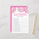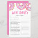 Quem sabe a melhor mãe? | Adicione este cartão de jogo de chá de fraldas divertido ao seu evento. Esta placa de jogo trivia chá de fraldas apresenta rosquinhas cor-de-água cor-de-rosa com bordas coloridas. Personalize adicionando nomes, eventos e datas. Este jogo de chá de fraldas cor-de-rosa é perfeito para qualquer época ou tema de chá de fraldas.