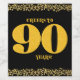 Uma comemoração de 90 com um retrato desajeitado do moderno 90 em um padrão de brilho dourado com borda de confete dourada sobre um fundo preto.