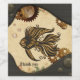 A maravilha mecânica do peixe-galo-do-oceano. O estilo steampunk apresenta detalhes complexos de preto e ouro. O peixe está rodeado de engrenagens e bolhas, em contraste com um fundo texturizado de pergaminho envelhecido. Os cantos das imagens são enquadrados com material e esferas escuras, metálicas, perfuradas. A estética geral é uma mistura de elementos mecânicos e orgânicos, criando um cenário de fantasia.