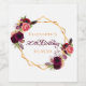 Um fundo branco chic com uma falsa estrutura geométrica dourada. Decorados com flores roxas escuras e burgueiras, rosas e penas do estilo "boho". Modelos para um nome e uma data. Data de nascimento ou data da festa, cartas de ouro. Com o texto: aniversário de 30 anos escrita com uma escrita à mão cheia de burlões.