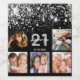 Para uma festa de aniversário de 21 (ou qualquer idade), celebrando sua vida com uma colagem de 5 fotos suas. Personalize e adicione um nome, 21 anos e uma data. Data de nascimento ou data da festa. Letras brancas e cinzas coloridas. Cor de fundo preto clássico, decorada com pó falso prateado