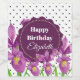 Com base na minha ilustração aquosa da íris púrpura com as suas pétalas multicolorido, roxa na parte externa e amarela no centro, com detalhes finos das pétalas e folhagem. O produto tem um padrão de bolinhas em preto-e-branco no fundo. O produto tem um nome de evento personalizável no centro e o nome impresso sob o evento, personalize-o em minha loja para um design personalizado.