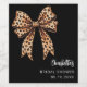 Um fundo preto. Decorado com um grande laço com estampa de leopardo. Personalize e adicione o nome da noiva e uma data. Letra cursiva preta estilo manuscrito.