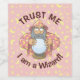 Um velho feiticeiro com capa rosa olhando para a bola mágica de cristal.