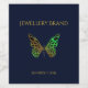 Adicione seus detalhes sobre esta borboleta verde e marrom em design de fundo azul escuro para seu negócio de joias.