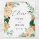 Belas etiquetas de vinho de casamento favorecem a decoração para compartilhar seu dia especial com seus convidados. Este vinheta típico de garrafa de vinho é perfeito para se ligar a qualquer vinho, vinho espumante ou garrafa de bebida, e tem tons pastéis macios e florais modernos de aquarela verde em tons de pêssego, branco, marfim creme, sábio e um verde mais brilhante. Este evento personalizado fornece coordenadas acessórios com a nossa coleção floral de cheio botânico boho de papelaria e artigos de papel para eventos.