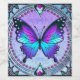 Uma borboleta vibrante com tons de azul e roxo é centrada dentro de um design circular ornamentado, cercada por intrincados padrões florais e joias decorativas. A composição total expele uma estética de vidro manchado com uma mistura harmoniosa de cores e simetria.