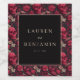 Este rótulo de vinho de casamento apresenta um design elegante com um quadrado preto central emoldurado por motivos florais vermelhos intrincados e sutilmente acentuado por caveiras, criando um tema gótico, mas romântico. A paleta de cores inclui vermelhos profundos, burgundies e pretos, complementados por texto em dourado suave em uma fonte clássica serifada que adiciona sofisticação. Perfeito para celebrações formais, este rótulo combina elementos macabros com florais ornamentados para transmitir um clima de mistério e refinamento, tornando-o ideal para aqueles que buscam um toque único e elegante para o seu dia especial.