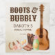 Botas e rótulos de vinho personalizados para chá de panela de caubói ocidental rodeo country brunch. Botas de caubói, vinho espumante, copos de vinho espumante, um anel, guitarra, ferradura para um chá de panela de caubói rústico ocidental.