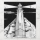 Uma ilustração a preto e branco do farol no final do banco de pedras em Nelson, Nova Zelândia. Este farol está no corte perto e tem a ilha de costa ao fundo.