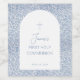 An arched blue and white religious design, recommended for boy's first communion, that combines the old and the new: a modern arch on a vintage blue and white floral pattern that resembles French toile de Jouy or chinoiserie. The name is written in script. The text is blue, inside the white arch. In the upper part of the arch, above the text there is a blue cross.