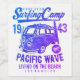 O Camp de Surfe do Combi é um design tipográfico colorido que apresenta uma van combi que transporta pranchas de surfe e texto tipográfico vibrante para lhe dar um tema de praia tropical. #praia #surf #tropical #combi #retrô #prancha #urbana #mar #verão #surfar #losangeles