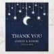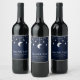 Rótulo de vinho de casamento celestial e vinho espumante. Céu noturno azul aquarela com estrelas e lua. Luzes de corda bokeh.