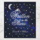 Para um casamento celestial com o tema "Está Escrito nas Estrelas". O texto é cercado pela lua e estrela em um fundo azul de uma noite estrelada.