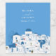 Um belo desenho do rótulo de vinho com ilustração rústica de Santorini, igrejas de cúpula azul, Bougainvillea, plantas de vaso aterrorizado com um fundo de lavagem branca na ilha grega. Um elegante destino Santorini, o desenho do casamento grego perfeito para casamentos do estilo Santorini e da ilha grega do Mediterrâneo. Os convites de casamento e outros artigos de papelaria também estão disponíveis.