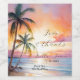 A design de casamento do tema da praia mostra o céu ensolarado da noite, palmeiras, oceano azul e praia arenosa. Personalize com seu próprio texto. Use a ferramenta Editar Design para alterar o tamanho, o estilo ou a cor da fonte. Veja toda a coleção de convites, bolsas de favoritos, adesivos, cartões de agradecimento, banner e muito mais...