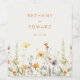 Este design combina elegância e capricho, combinando texto moderno minimalista com uma fileira de delicadas flores silvestres em aquarela perfeitas para casamentos inspirados em boho.