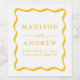 Adicione um toque personalizado ao seu janto de recepção de casamento, festa de noivado ou ensaio com rótulos de vinho de Quadro de Onda Amarelo Moderno personalizados. A design mostra seus nomes, data do casamento e local do casamento em letras em negrito amarelo cercado por uma borda ondulada amarela contrastando com um fundo branco. As etiquetas de vinho retrô coordenam-se com a nossa coleção de casamentos do Modern Wavy Frame.