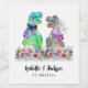 O tema do Dinossauro é o rótulo de vinho de casamento para deleitar seus hóspedes com noiva do Dinossauro engraçada e noiva em um belo prado colorido de flor silvestre. Noiva e noiva de Watercolor T-Rex sendo roarosos em cores brilhantes e psicodélicas modernas assumem a ilustração pré-histórica dos dinossauros e são fáceis de personalizar com os nomes da noiva e do noivo e a data do casamento em um divertido roteiro tipográfico. Engraçado Tyrannosaurus Rex noiva e noiva e cor d'água ilustrações florais de verão em tons roxos, cor-de-rosa, verde e laranja. Dino original único e trabalho de arte floral de verão da artista Catherine Sweetman