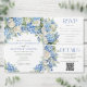 Design de casamento floral elegante com arranjos florais pintados a aquarelas de flores azuis de hydrangea, verde e rosas brancas.