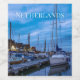 Pintura da vila tradicional de pesca à noite. Vista do porto de Volendam e iates, embarcações e embarcações à vela ancorados nos Países Baixos. Marinha com casas iluminadas e céu azul