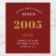 Rótulo de Vinho Elegante Vermelho e Dourado aniversário de 21 anos de 2005. Celebre seu marco com nossa exclusiva etiqueta de vinho Vintage aniversário de 21 anos. O rótulo meticulosamente projetado com matizes de preto e ouro impressionantes melhora sem esforço o apelo visual do seu vinho favorito. O ano de 2005, destacado no rótulo, acrescenta uma nostalgia ao dia do seu nascimento. Usando material de qualidade premium, este rótulo garante longevidade, cimentando ainda mais seu lugar como uma lembrança memorável da celebração especial de aniversário de 21 anos. Além disso, aproveite o benefício de personalizar este rótulo com seu nome, acrescentando um toque único e íntimo à sua celebração. ・ Design Vermelho e Dourado espantoso: dá uma aura de sofisticação e elegância a qualquer garrafa de vinho, fazer-a como uma peça central perfeita para a sua celebração de aniversário de 21 anos. Ano 2005 Apresentado: Adiciona um toque nostálgico, fazer que se sente especial no seu aniversário de marco. ・ Material de alta qualidade: Assegura que a etiqueta de vinho resida no teste do tempo, evoluindo para um momento Esasaemque que você irá apreciar ・ Totalmente Personalizado: Adicione seu nome à etiqueta para um toque íntimo e único nas suas comemorações ・ Fácil de Aplicar: A parte de trás da etiqueta é autoadesiva, garantindo uma aplicação sem complicações na sua garrafa de vinho