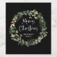 Estas etiquetas simples e na moda apresentam uma fôrma camada aquática com folhas verdes e falsas de ouro e groselhas vermelhas, e uma tipografia moderna branca que diz "Feliz Natal" num fundo preto escuro.