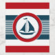 Design náutica com decoração em forma redonda de embarcações à vela, em fundo listrado, a azul, vermelho e branco
