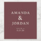 This elegant wedding wine label features a simple, sophisticated design with a rich maroon background and clean white text. The layout is minimalistic, with ample negative space that highlights the modern serif typography, creating a balanced and formal aesthetic. Perfect for celebrating special moments, this label conveys elegance and simplicity, making it ideal for weddings or significant events. Customizable elements allow you to personalize the labels with names and dates, ensuring they reflect your unique celebration.