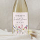 Elegantes rótulos de vinho para festa de noivado com flores, apresentando uma borda inferior de flores silvestres em aquarela e folhagens em tons de rosa, amarelo, roxo, azul e verde em um fundo rosa chá. Personalize os rótulos de vinho de flores silvestres com o nome da noiva e a data. Os rótulos de vinho personalizados de flores silvestres são perfeitos para festas de noivado na primavera e no verão.