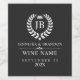 Design de rótulo de vinho simples e elegante. Uma coroa de louros brancos com um monograma personalizável. Modelo de texto personalizável e em segundo plano com alteração de cinza escura.