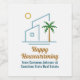 Esta bonita marca de vinho da empresa imobiliária tropical apresenta uma moderna casa azul de praia com uma palmeira legal e sol-ilha. Personalize este item do marketing residencial costeiro com seu agente e nome comercial real para uma casa aberta.