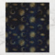 O padrão celeste de ouro do universo moderno apresenta uma coleção de luas, sol, rajadas, estrelas, triângulos e o talismã mau de proteção mística, em folhas de ouro brilhantes, azul escuro e fundo azul escuro. Uma ilustração de símbolos de geometria sagrada da alquimia.
