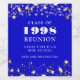 Segundo grau comemorativo personalizado e personalizado ou etiqueta de reunião de classe universitária ou vinho ou bebida que pode ser usada para qualquer classe de graduação (o ano é editável) com seu ano de aula, nome da escola e data e/ou local. O design apresenta estrelas douradas e luzes de cordas contra uma cor azul real de fundo editável que você pode facilmente mudar para a cor da sua escola. Torna a reunião de excelentes de centros de mesa, guardas comemorativos, favores, prêmios ou doações. ALTERAÇÕES: As cores de fundo e texto podem ser alteradas clicando na FERRAMENTA EDITAR USANDO DESIGN na seção PERSONALIZAR. ASSISTÊNCIA: para obter ajuda sobre modificação ou personalização do design, alteração de cor, redimensionamento, transferência do design para outro produto ou você gostaria de coordenar itens, entre em contato com o designer ANTES DE ENCOMENDAR através da guia MENSAGEM de bate-papo Zazzle abaixo ou envie um email para makeitaboutyoustore@gmail.com.