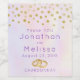Etiqueta de garrafa de vinho de castigo com um confete de ouro falso esborrifado ao longo do topo. 2 anéis de casamento de ouro abaixo do seu texto personalizado. Um fundo de cor d'água pálido e amarelo.