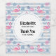 Agradeço ao seu partido que favoreça as etiquetas de garrafas com um padrão com uma vibração de verão divertida. flamingos e abacaxis cor-de-rosa, colocados sobre um padrão listrado azul claro com folhas e corações ao redor.